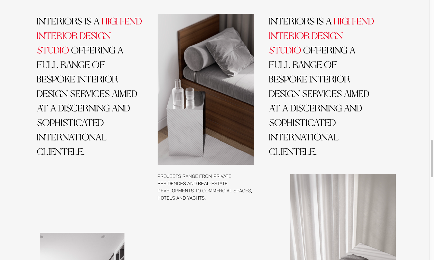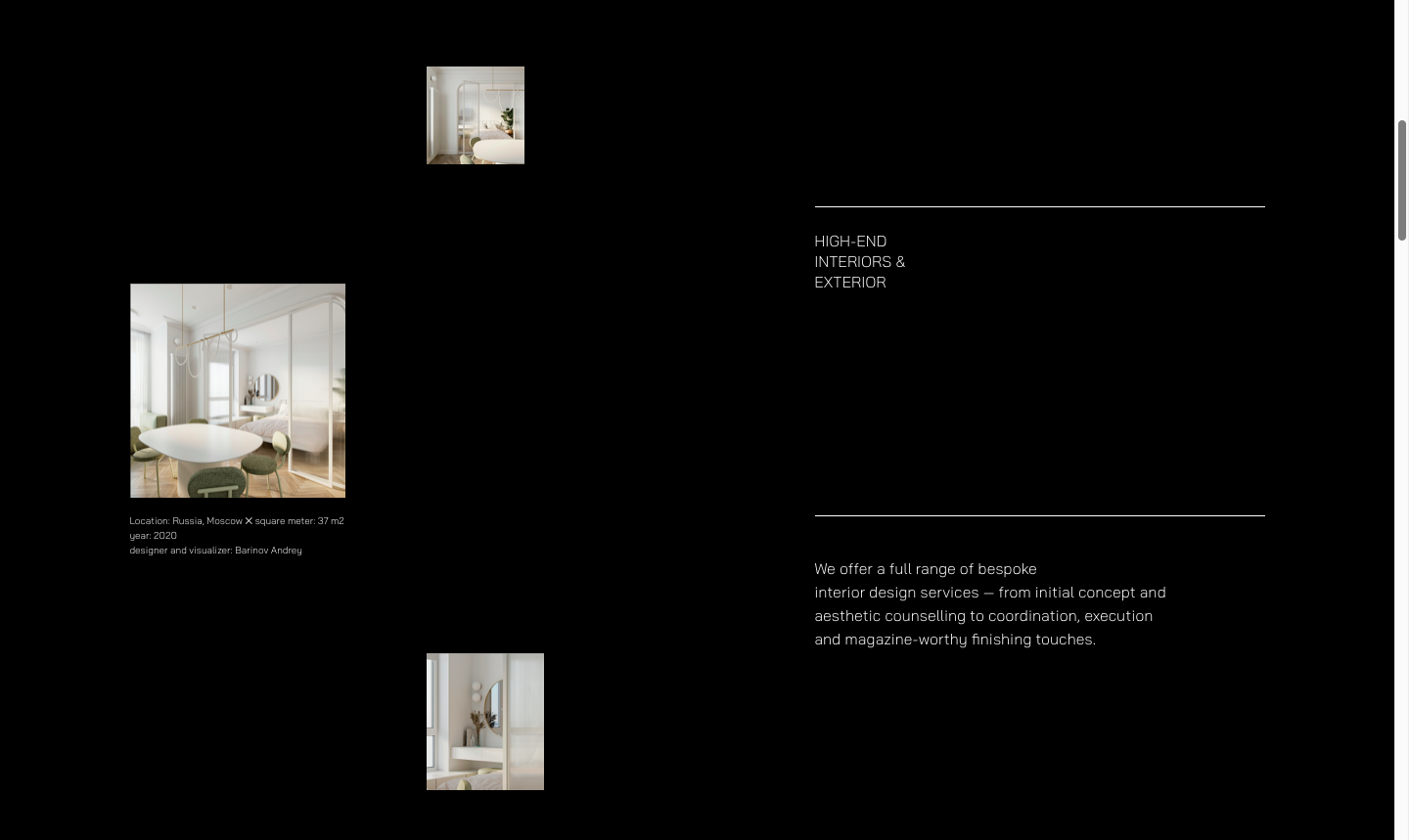 Пример разработки лендинга для ниши интерьерного дизайна. Стояла задача отработать сложную анимацию. Фокус внимания был сделан на фотографии работ студии и взаимодействия с пользователем.