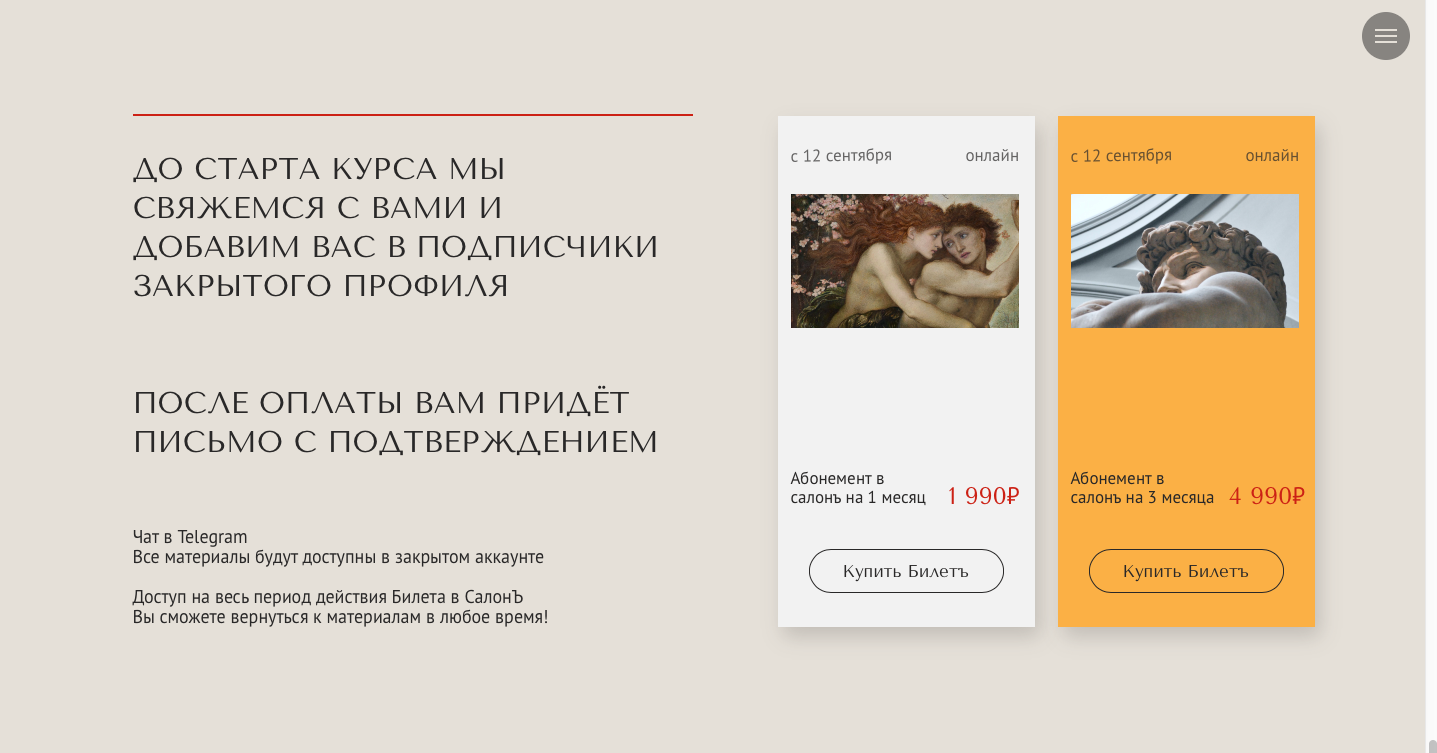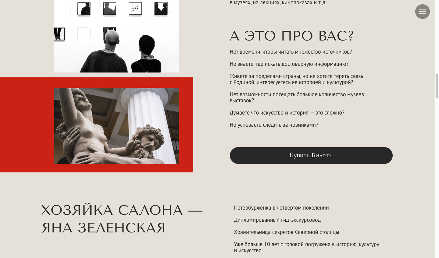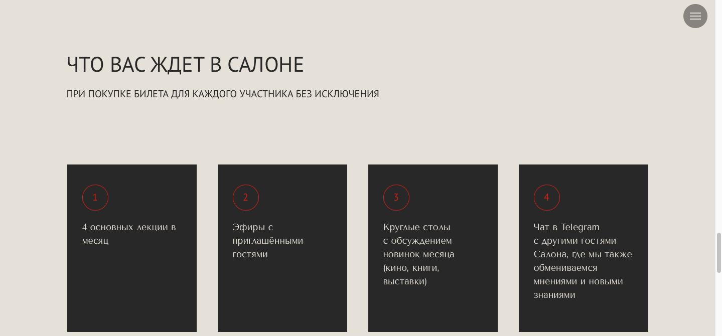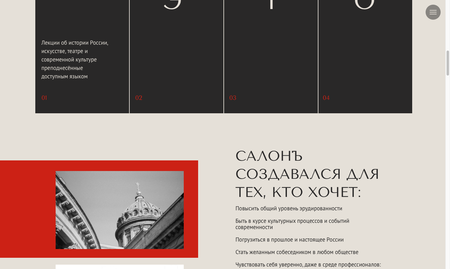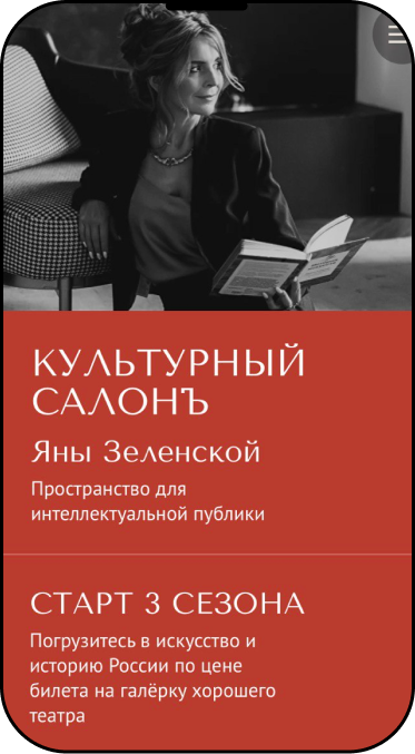Лендинг знакомит пользователя с основательницей проекта и ее лекциями, которые проходят в формате онлайн и офлайн встреч с участниками. Блоки на сайте рассказывают о Салоне, кому он будет полезен, что в него будет входить, о формате проведения и стоимости. Сайт ориентирован на женскую аудиторию в возрасте от 25 до 50 лет.